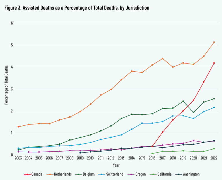 In 2016 lag het aantal euthanasiegevallen op 1018, toont het Cardus-rapport op basis van officiële cijfers. In 2022, het jaar met de meest recente cijfers, groeide dit aantal naar 13.241 – dertien keer zo hoog. Een explosieve toename: Canada is momenteel het tweede land ter wereld met de meeste euthanasiegevallen, na Nederland. Euthanasie is nu de zesde belangrijkste doodsoorzaak in Canada, voorafgegaan door beroertes, ongelukken, hartaandoeningen en kanker.