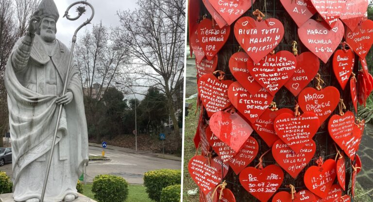 Ook bij de Sint-Valentijnbasiliek, op een heuvel twintig minuten buiten de stad, hangen er honderden ‘hartenkreten in plastic’ aan de boomstammen. “Valentijn bescherm mijn kinderen”, en meer soortgelijke, korte gebeden om voorspraak, bescherming en dankzegging.